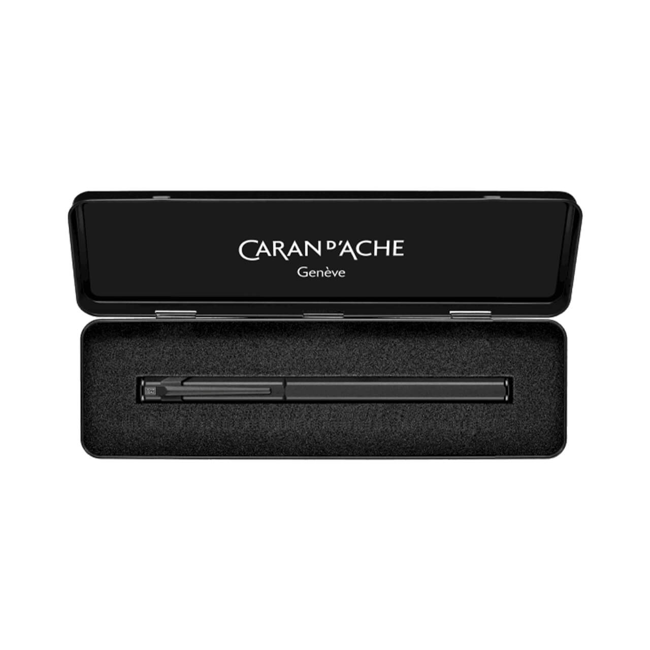 Brilliant black metal case with white Caran d’Ache logo on the interior and exterior