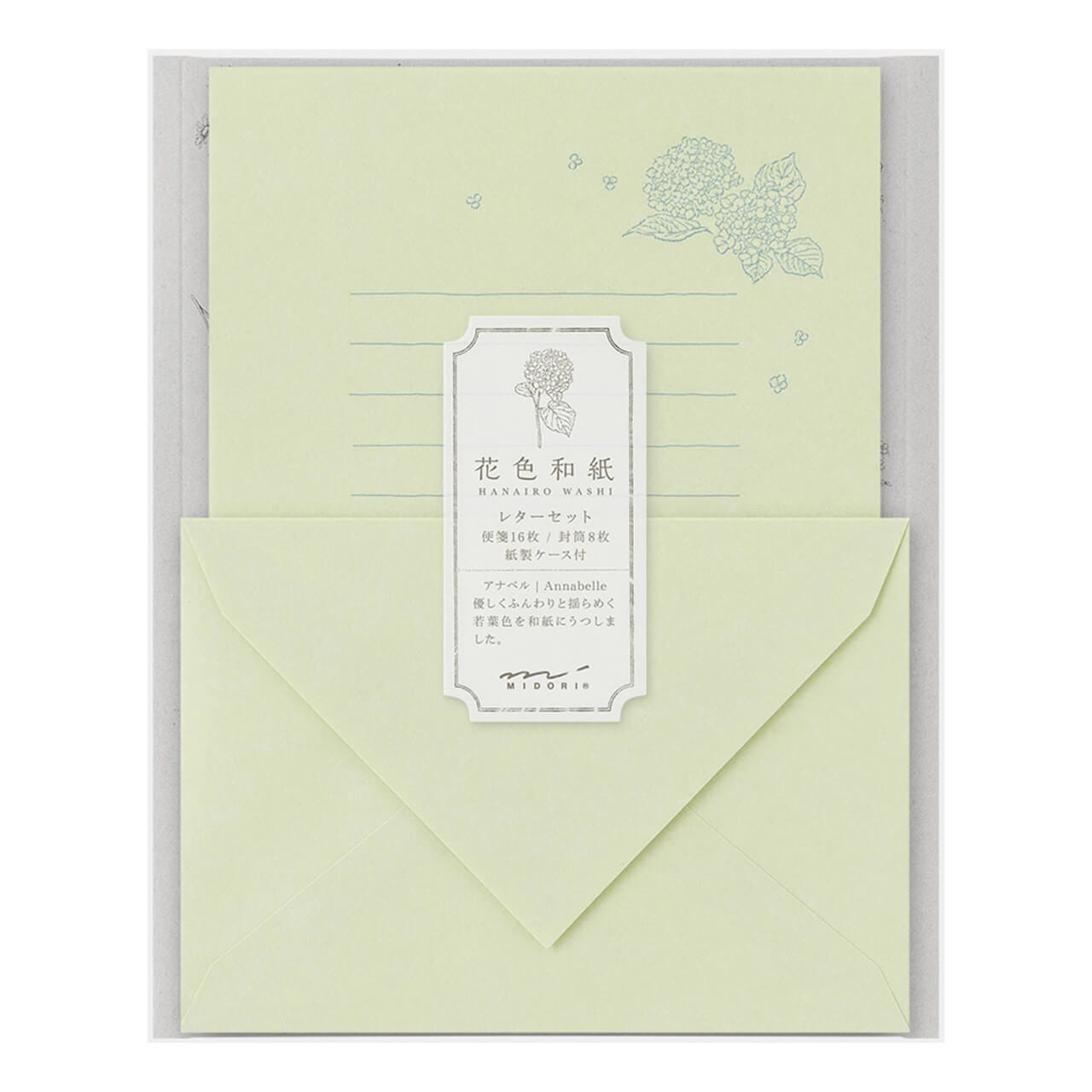 The flowers on the packaging and letter paper are the work of illustrator Megumi Sasaki. The soft, detailed floral illustrations give the pale-colored Japanese paper a gentle look.