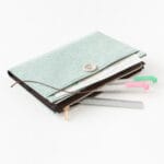Yuru Log is a new notebook series developed so that anyone can easily relax, have fun, and continue writing their daily records. It has a zipper pocket with high storage capacity and can carry writing utensils, stickers, masking tape, scissors, etc. together. It comes with a pen holder for inserting a pen up to 15 mm in diameter. The accent button is designed to be fastened by wrapping a string around it.