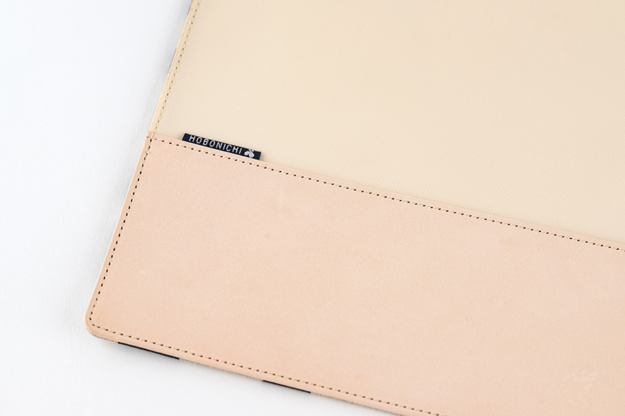 The cover interior is a natural leather to enjoy it maturing, and there is a tag on the bottom-right.